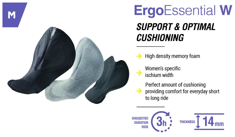 Doté d’une peau de chamois Ergo Essential Women, il garantit un amorti progressif grâce à ses deux densités de mousse. Ce système améliore le soutien sur la selle et limite les points de pression jusqu’à 3 heures de pratique.