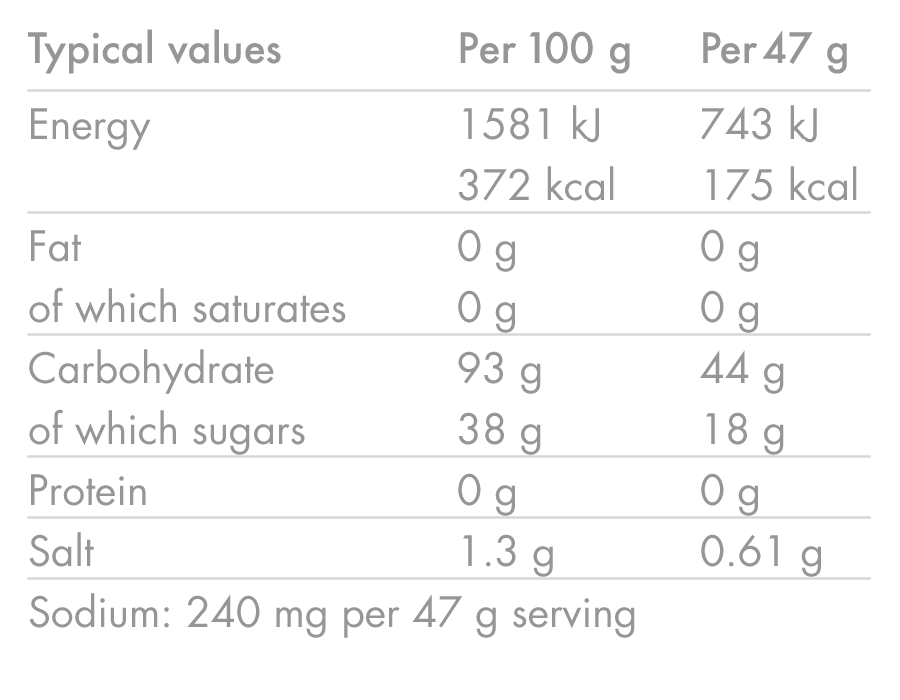 • 2:1 maltodextrine/fructose Langere energie, betere spijsverteringstolerantie.